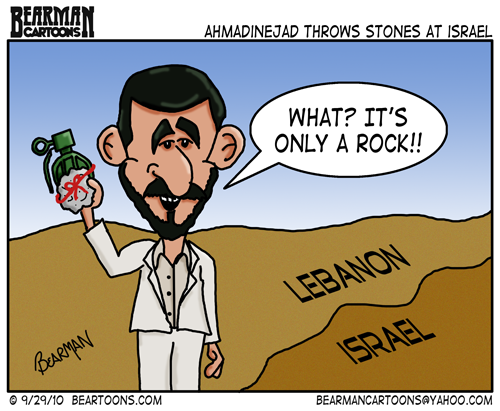 So after appearing at the United Nations and joining the wacko conspiracy theorists that the United States planned the attacks of September 11, 2001, Iranian President Ahmadinejad is back for more. It seems on a planned trip to Lebanon he indicated that he will throw a symbolic stone at Israel just to show how much he hates that country.