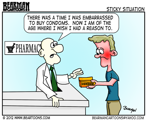 Today’s cartoon on condom purchasing and the embarrassment it can cause was inspired by real life. The other day I had a few things to pick up at the grocery store and I was waiting in line behind a 20 something woman who confidently held a box of condoms in her hand ready to purchase. I thought to myself that I was so happy to be married so I didn’t have to deal with that anymore.