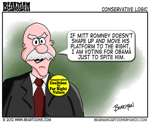 With today’s editorial cartoon, I have no doubts that a conservative would never vote for Obama to spite Romney. However it is true that many conservative groups are calling on him to move to the right or lose their support. So isn’t that really the same thing? Tony Perkins (no not the actor), of the conservative group Family Research Council said this: “And so if the party is moving in a different direction, we are not going there. The only reason there was an alignment with Rick Santorum from our constituency is because Rick embraced the ideas, the policies and the principles that our organization and our constituency believes in…If they don’t, they’re not going to get the unbridled enthusiastic support that Rick Santorum enjoys.”