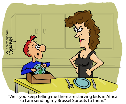 Good on you kid, you can send mine too. I said a similar thing to my Mum when I was a kid. She knew I didn’t like tem but she would still cook them for us, my sister hated them too. Mum said “There are starving kids on the other side of the world who would appreciate brussel sprouts for dinner” So I said “Well send them to them because I don’t want them” Then I got slapped for being cheeky. I thought I was providing a practical solution. I didn’t want them & they did. Problem solved, so why did I get slapped???