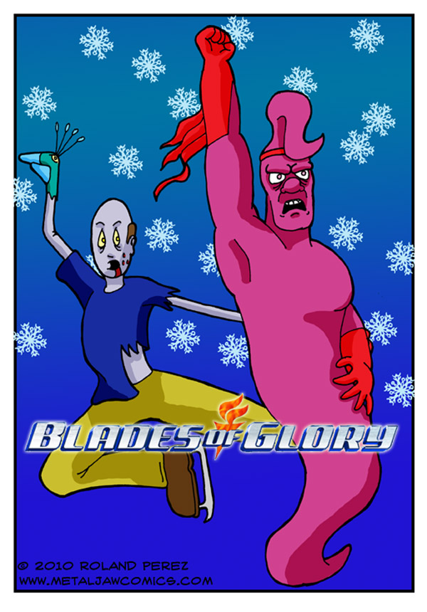 Today up is Roland Perez of Metal Jaw Comics. Roland asked for a do-over. Some of you recall he did this guest cartoon back in June where he spoofed the movie Rosencrantz and Guildenstern Are Dead. He thought many people hadn’t heard of that movie so this time he decided to spoof a classic. Blades of Glory, starring Will Ferrell and Jon Heder.