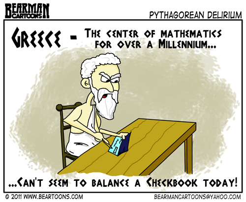 Today’s editorial cartoon is inspired by the financial crisis in Greece. Where is Pythagoras when you need him? How is it that a culture that is known for their advancement in certain areas falls away from what made them great?
