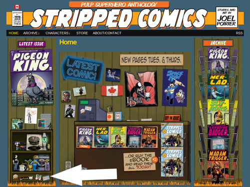 Something that is funnier on paper is Joel Poirier’s Stripped Comics. Joel recently revamped his website to look like a comic book store. I joked that he needed a Bearman doll on the shelves.
