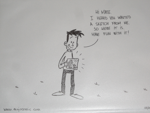 Not to be outdone, Oskar van Velden AKA Skar from Mojo Comic also has contests ongoing on his webcomic. As last months winner I got a custom cartoon of Ben (one of my favorite characters…mainly because he tends to end up the butt of the jokes). Here is my prize.