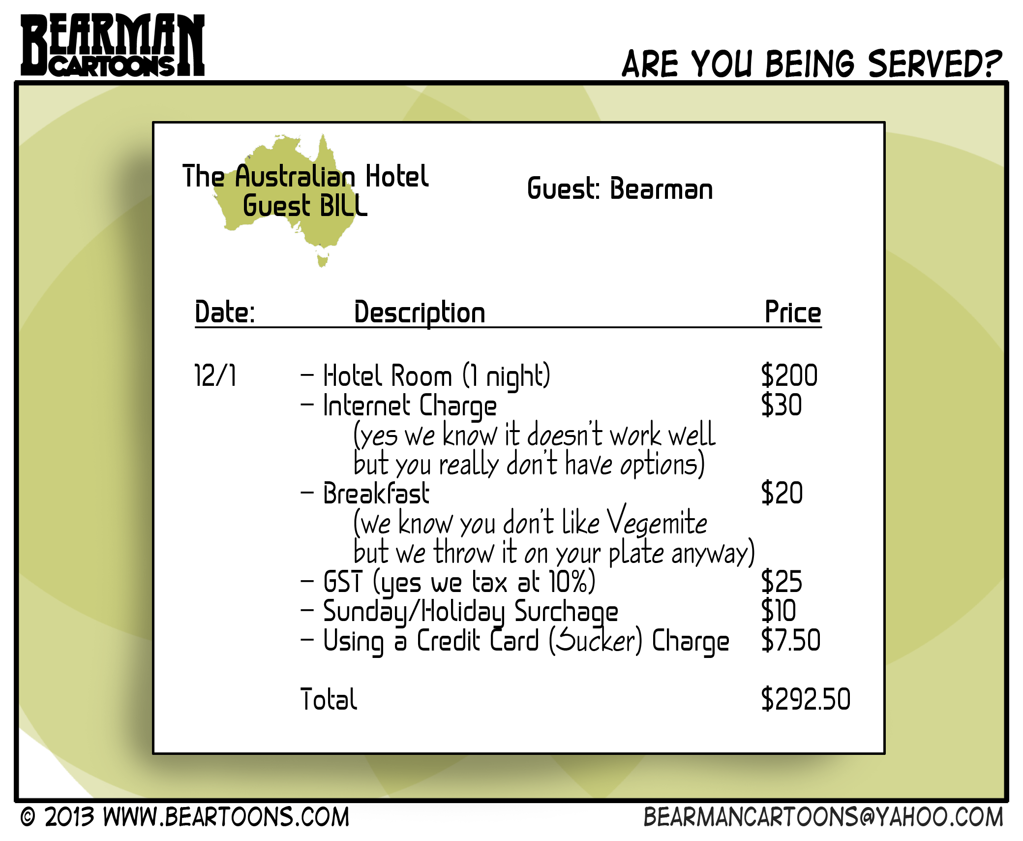 Today is just a small example of some of the funny hotel charges we incurred while in Australia.