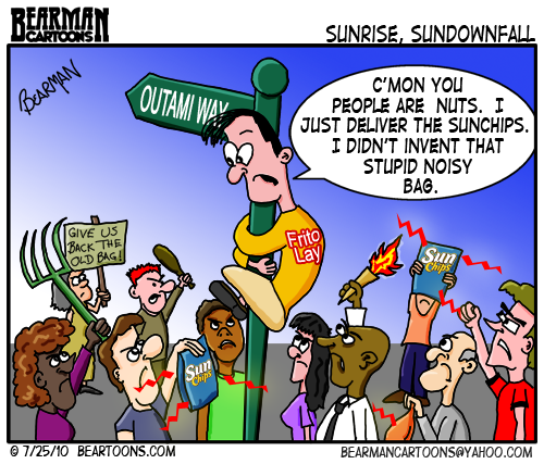 Now I am afraid to even go down the chip aisle for fear of someone grabbing a bag. I mistakenly went down one day while the poor Frito Lay delivery guy was restocking the shelves. I told him how bad I felt that he had to spend his day listening to that awful noise while stocking the SunChips. He didn’t say anything but gave me a pleading look to help him find a way out of his misery.