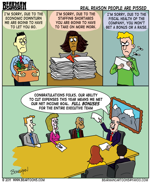 This editorial cartoon is for my Occupy Wall Street friends. I am sure I will piss you off with a future cartoon but for now, I wanted to show my solidarity for one reason people should be rightfully pissed. Companies talk about teamwork and performance, etc etc etc. But damned if the executives can’t find a way (read excuse) to make sure their bonuses are intact while the rest of us have to do more with less.