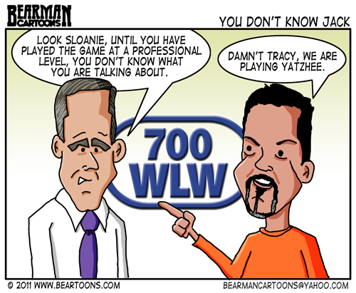 It’s been a while since I have done an editorial cartoon with a local flair. Tracy Jones and Scott Sloan do an afternoon talk show on 700WLW in Cincinnati. Tracy played professional baseball for 5 years (on five different teams). Taking nothing away from that accomplishment, Tracy (tongue in cheek) is always telling Sloan that he doesn’t understand: