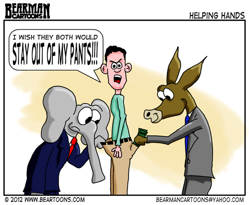 This editorial cartoon is timely as we heat up all the rhetoric that is going to happen during the campaign. Those of you who know me know I am a moderate who one day will poke fun at the left and another at the right. Today you get a two for one. Whether Democrat or Republican they both are interested in what I have in my pants and what I am doing with it. Democrats are always after our money and Republicans are always interested in what we are doing with our bodies (gay marriage, abortion, sex in general). Ok to be honest I too am completely against abortion BUT that doesn’t mean I am prepared to completely ban it either. Good thing I don’t run for office because they would say I was wishy washy.